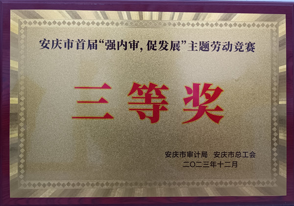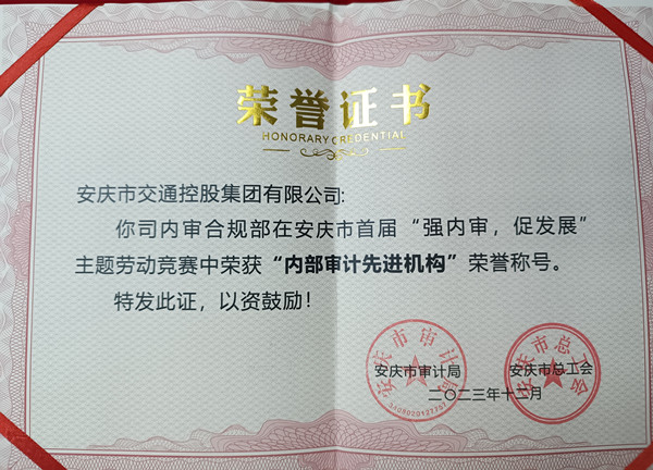 1月26日,安慶市首屆“強內(nèi)審,促發(fā)展”主題勞動競賽頒獎儀式在市審計局舉行。市交控集團內(nèi)審合規(guī)部榮獲履行內(nèi)部審計職責(zé)類競賽項目三等獎及內(nèi)部審計先進機構(gòu)榮譽稱號。