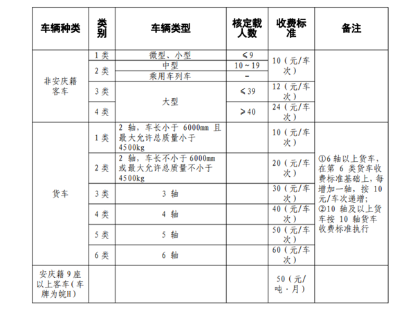 車輛收費(fèi)標(biāo)準(zhǔn)按照省交通運(yùn)輸廳、省物價(jià)局《關(guān)于調(diào)整我省路橋通行費(fèi)收費(fèi)標(biāo)準(zhǔn)的通知》(皖交財(cái)〔2010〕391號),省交通運(yùn)輸廳、省發(fā)展改革委、省財(cái)政廳《關(guān)于印發(fā)安徽省收費(fèi)公路車輛通行費(fèi)計(jì)費(fèi)方式調(diào)整方案的通知》(皖交路〔2019〕144號)等文件執(zhí)行。持有安徽交通支付卡(ETC)的車輛,根據(jù)省交通運(yùn)輸廳、省發(fā)展改革委《關(guān)于落實(shí)收費(fèi)公路ETC車輛通行費(fèi)優(yōu)惠政策的通知》(皖交運(yùn)〔2019〕204號)規(guī)定,客車給予95折優(yōu)惠,貨車給予85折優(yōu)惠。外省ETC用戶給予95折優(yōu)惠。具體見下表: