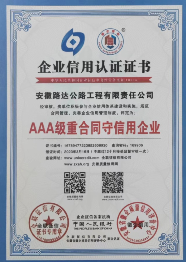近日,經(jīng)全聯(lián)征信有限公司和安徽省徽企質(zhì)量信用評價中心聯(lián)合認證,安徽路達公司榮獲“AAA級重合同守信用企業(yè)”。