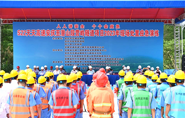 6月21日上午, 2023年安慶市交通建設(shè)工程安全應(yīng)急演練在S22天天高速營嶺隧道項(xiàng)目拉開序幕。